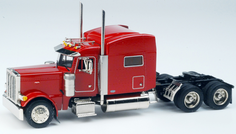 The only truck or truck tractor produced by Classic Mint Collectibles, LLC was the Peterbilt 379 extended hood truck tractor in several configurations (four axle day cab heavy haul and three axle sleeper) and multiple paint schemes. This remarkable brass model created a completely new level of expectation of what was possible in HO scale vehicle models. The brass sheet material used for the cab and hood construction was thin enough to accurately replicate the prototype extremely well without sacrificing structural integrety. All the Peterbilt models shared an array of plated accessories that were very well executed. This model, one of a limited series of factory painted tandem drive axle truck models with 70" Unibilt sleeper, featured all brass construction with highly detailed Cummins Signature 600 engine, plated muffler heat shields, plated Alcoa wheels, tires with raised letters and correct tread patterns for steer and drive positions, detailed engine compartment and cab interior, simulated trailer air brake lines and electrical cable, and Holland fifth wheel. Finished in gloss maroon. Feature List - #14037